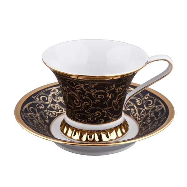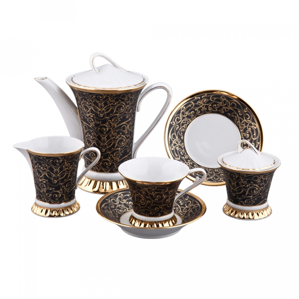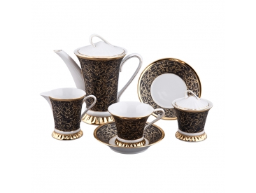 твёрдый фарфор, позолота 24 карата, ручная работа 15 предметов (чайник - 0,75 л, сахарница - 0,1 л, молочник - 0,15 л, чашка с блюдцем 6 шт. - 0,2 л)